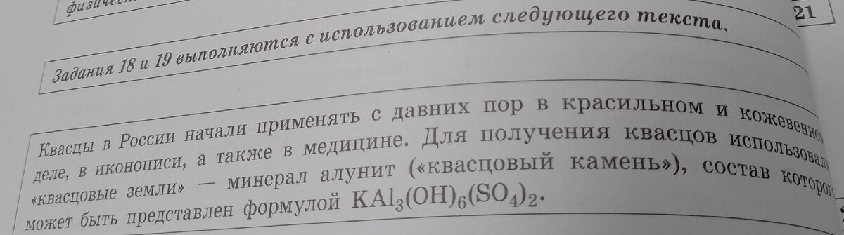 Вариант √3 задание √18 Минерал алунит или квасцовый камень используется в иконописи и медицине - KAl3(OH)6(SO4)2. Вычислите в процентах массовую долю алюминия в алуните. Запишите число с точностью до сотых. Здесь показана последовательность действий 👇 Массовую долю элемента находим по формуле: n - число атомов, конкретного элемента, определяем по формуле вещества Ar(Э)- относительная атомная масса элемента, определяем по табл. Менделеева. Например, у азота Ar(K)=39, у алюминия Ar(Al)=27, у серы (S)=32 у кислорода Ar(O) =16 Mr-молярная масса вещества Находим Mr KAl3(OH)6(SO4)2= 39+(27×3)+(16×6)+(1×6)+(32×2)+(16×8)=414 w (Al)= Ar Al ×3/ Mr KAl3(OH)6(SO4)2=81/424=0.1957 Переведём в проценты, умножив на 100% ответ: 19,57 (с точностью до сотых). задача √19 В 19 задаче даны условия с массовой долей содержания одного вещества в другом веществе. Важно внимательно прочитать задачу. Как правило в подобных заданиях используются формулы на определение массовой доли одного вещества в другом(смес