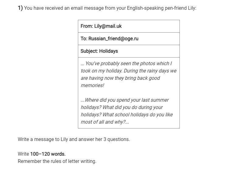 В этой статье мы с Вами научимся писать электронное письмо другу. ПРИМЕР ЗАДАНИЯ Нам дается письмо-стимул от зарубежного друга и предлагается написать ответ, в котором надо дать полные и точные ответы на три вопроса, соблюдая правила обращения и нормы вежливости , принятые в англоязычной среде. КРИТЕРИИ ОЦЕНИВАНИЯ Главной задачей считается решение коммуникативной задачи (РКЗ). Проще говоря надо дать понять, что Вы поняли о чем спрашивают и смогли правильно среагировать на вопросы. Обязательно нужно поблагодарить друга по переписке за письмо и выразить надежду на будущие контакты. Правильно выбрать стилевое оформление, дать обращение, завершающую фразу, подпись автора. При получении за РКЗ 0 баллов, всё задание оценивается в 0, если объем письма меньше 90 слов, оценка-0, если больше 135, то проверяются только 120. Если всё правильно, то получаем 3 балла. Как оценивается ОРГАНИЗАЦИЯ ТЕКСТА. Текст должен быть логичен, правильно поделен на абзацы, использованы средства логической связи "Y