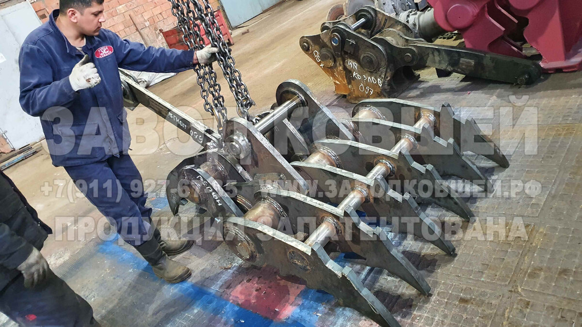 Для монтажа на базовую машину присоединительные размеры корчевателя должны соответствовать габаритам рабочего оборудования, как и диаметры пальцев. Мы контролируем собираемость изделия после завершения его производства. Проверяем следующие размеры: длину рычага упора, посредством которого корчеватель крепится к полке рукояти; расстояние между проушинами верхней челюсти, которые служат для соединения с тягой, и высоту этих проушин; расстояние между проушинами челюстей, с помощью которых челюсти зафиксированы между собой и образуют шарнирный узел с проушиной рукояти. Если предусмотрена эксплуатация изделия сразу на двух моделях экскаваторов, присоединительные размеры рабочего оборудования которых несколько отличаются друг от друга, то в комплекте с пальцами идут специальные шайбы. Агрегатируемость наших корчевателей находится на должном уровне. To be properly mounted on the base vehicle, the coupling measurements of up-rooter must be in conformity with the ones of the working equipmen