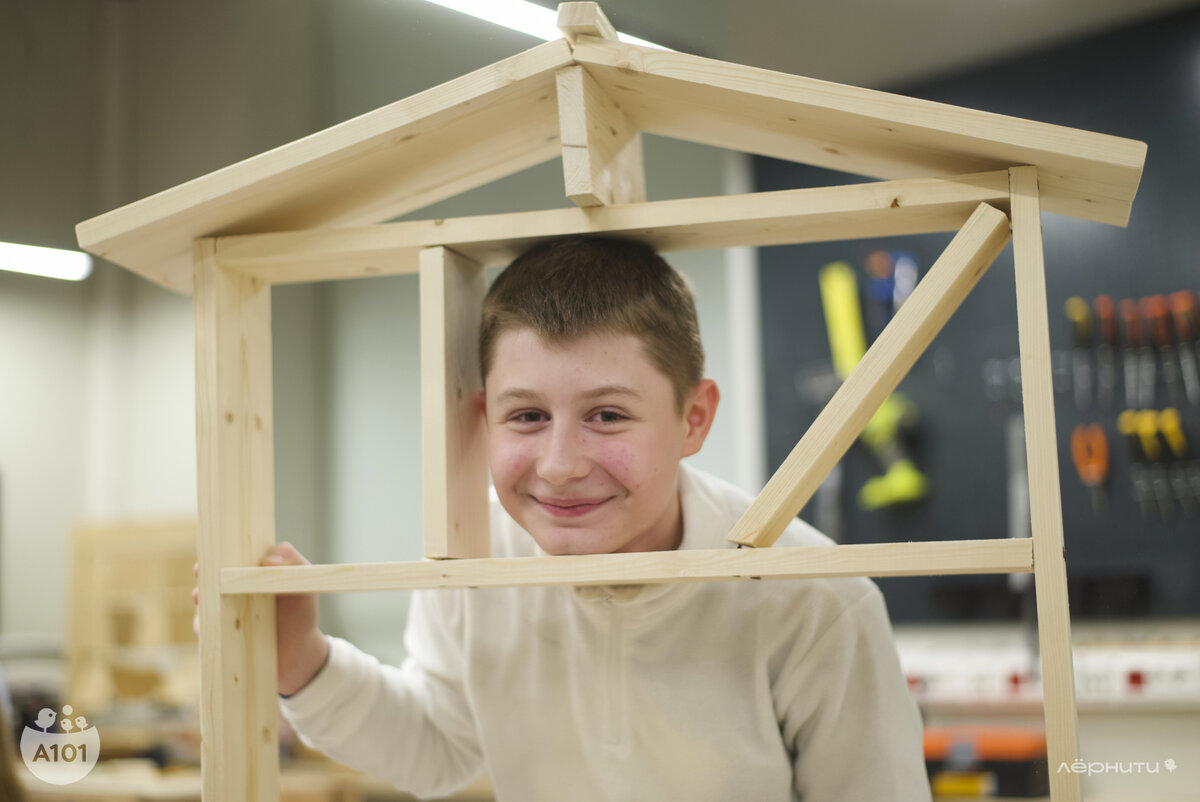 Гриша – наставник в столярной мастерской Лёрнити – показывает нам, каким инструментом лучше воспользоваться в данный момент, как сменить сверло, какие взять шурупы. При этом он не даёт никаких указаний по содержанию и творческому процессу, не указывает, где поставить перегородку.