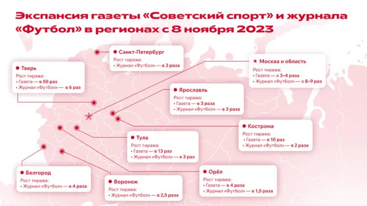 Значительно увеличился тираж в Москве и области, Санкт-Петербурге, Туле, Твери, Белгороде, Орле, Костроме, Ярославле, Воронеже. Редакция «Советского спорта» объявила о кратном увеличении тиражей и точек продаж в регионах России с 8 ноября. В Москве и области тираж газеты будет увеличен в 3-4 раза, а в Туле сразу в 13. При этом в большинстве киосков Ярославля, Костромы, Орла и Твери газета появится в продаже впервые после долгого перерыва. Значительно вырос тираж журнала «Футбол»: в Орле в 1,5 раза, в Костроме в 2, в Воронеже в 2,5, в Туле, Твери и в Санкт-Петербурге в 3, в Белгороде в 4, в Москве и области в 8-9 раз. В Ярославе «Футбол» столь массово появится в киосках впервые. Главный редактор «Советского спорта» Евгений Слюсаренко обосновывает решение увеличить тиражи и количество точек продаж большим спросом на бумажные носители и желанием вновь придать веса некогда лидеру среди спортивных медиа России: — 2023 стал годом больших перемен в «Советском спорте». Весной значительно обнов