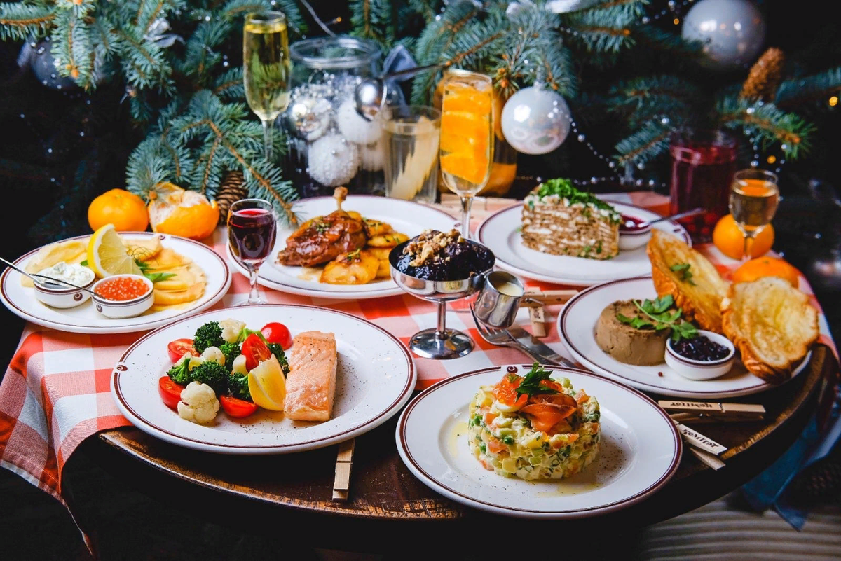 1. Закуска: Салат "Оливье" с картофелем, морковью, горошком, яйцами и мясом. Приготовьте все ингредиенты, нарежьте их мелкими кубиками, смешайте и добавьте майонез для сочности.