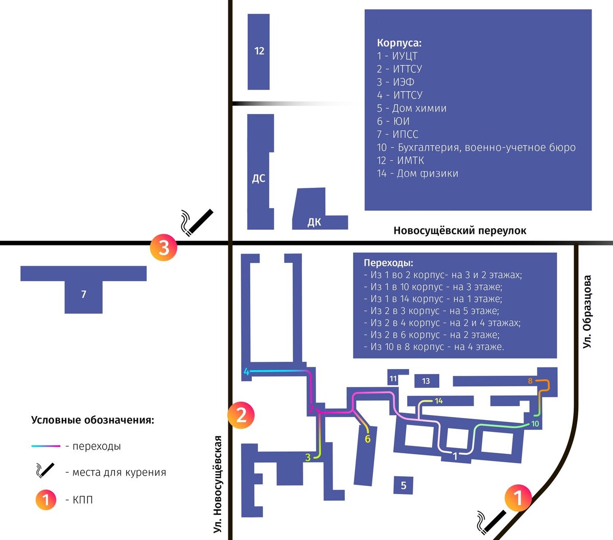 Учебные и административные корпуса Российского университета транспорта для удобства связаны сетью переходов, этот список поможет их запомнить