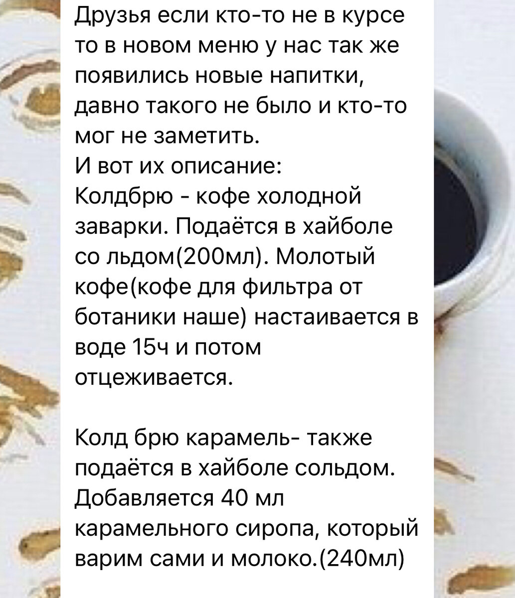 По временам в заведениях изобретают всякого разного рода «новинки», чаще всего - под предлогом сезонности и прочих радостей непостижимо локальных продуктов, неких таких особых, непостижимо редких специалитетов и т.д. Кухня - отдельная вотчина, а вот в баре за этим зачастую скрывается необходимость рәхәтләнеп реализовать всякий неликвид: давно лежащие без дела сиропы, продукты, иногда - крепкий алкоголь; и т.д. Когда в меню появляются новинки - необходимо сообщить линейному персоналу об их наличии (хотя это необязательно, менеджмент регулярно пропускает этот этап), а также - об их составе (что тоже не является обязательным, можно указать только приблизительно и опустить ключевые моменты - например, что новый напиток алкогольный). Описание новинок всегда скучное: Вот другой пример, с сохранением специфики оригинала: Мокко Берём питчер, в него насыпаем 40г молочных галет. Подносим питчер с галетами к капучинатору и в течении 15 сек обдаем паром(Чтобы они немного подтаяли). Затем варим в п