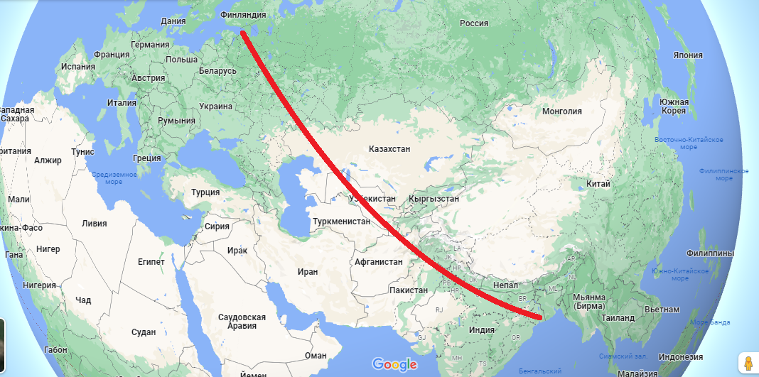 Давайте с вами порассуждаем о возможном великом железнодорожном маршруте, с помощью которого можно было бы создать ещё одну альтернативу морским железнодорожным перевозкам, который будет подконтролен исключительно только тем государствам, на которых он находится. Если воспользоваться расширенной версией гугл карт, на которых земля в виде глобуса, то несложно заметить, что следующие города находятся практически на одной прямой линии: Хельсинки, Санкт-Петербург, Москва, Саратов, Индеборский, Туркменабад, Мазари-Шариф, Кабул, Исламабад, Лахор, Нью-Дели, Калькутта. Если эти города находятся на одной линии, то почему бы их не соединить единой системой железных дорог? Это была бы действительно монструозная сеть железных дорог, которая объединяла бы сети нескольких государств в единый транспортный коридор. Основной проблемой данного железнодорожного маршрута является то, что Индийская и Русская колея имеют различную ширину колеи (1676 - Индийская колея, 1520 - Рус