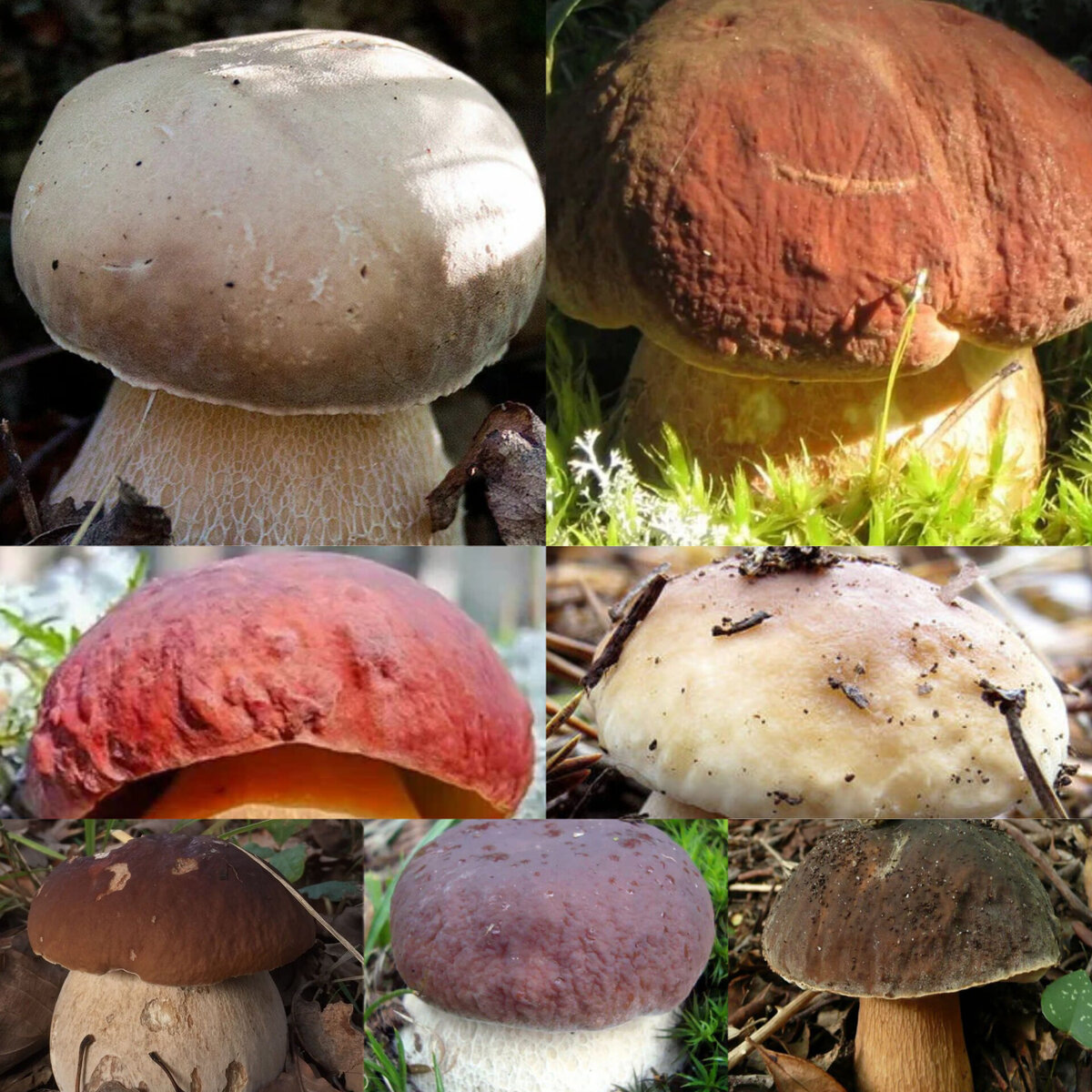 Не один и не два вида грибов называют Белый гриб, их множество. Объединяет их одно семейство Болетовые и один род Боровик. Основной, определяющий признак это то, что мякоть гриба всегда остаётся белого цвета. Внешний же облик существенно отличается по видам. Особенно цветом шляпки молодых, совсем юных грибов. Посмотрите какая гамма цвета. Цвет шляпки может быть почти белым, буроватым, коричневым всех оттенков, розоватым, фиолетовым и ещё множества тонов. Практически радуга лесная. И это всё — Белый гриб. Иногда попадаются Белые грибы с абсолютно белой шляпкой. Причём это может быть любой из перечисленных видов. Такое случается с некоторыми из них, когда грибник добывает гриб, разгребая подстилку. Часто шляпка не видевшая «свету белого» сама бывает белой. Выглянув на солнышко такой гриб быстро приобретает характерный для вида цвет. Белый это гриб, образующий микоризу, то есть живущий в симбиозе с деревом. У каждого вида свои предпочтения к соседям. Чаще всего это: Исключения бывают, н