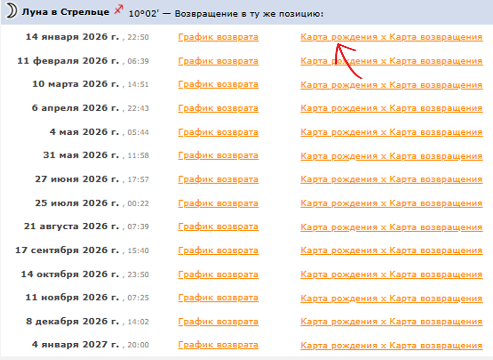 Мне нравится рассчитывать лунары в Astro Seek, потому что там можно посмотреть полный календарь на год. Здесь вы можете отдельно увидеть карту лунара и взаимодействие с вашей натальной картой.