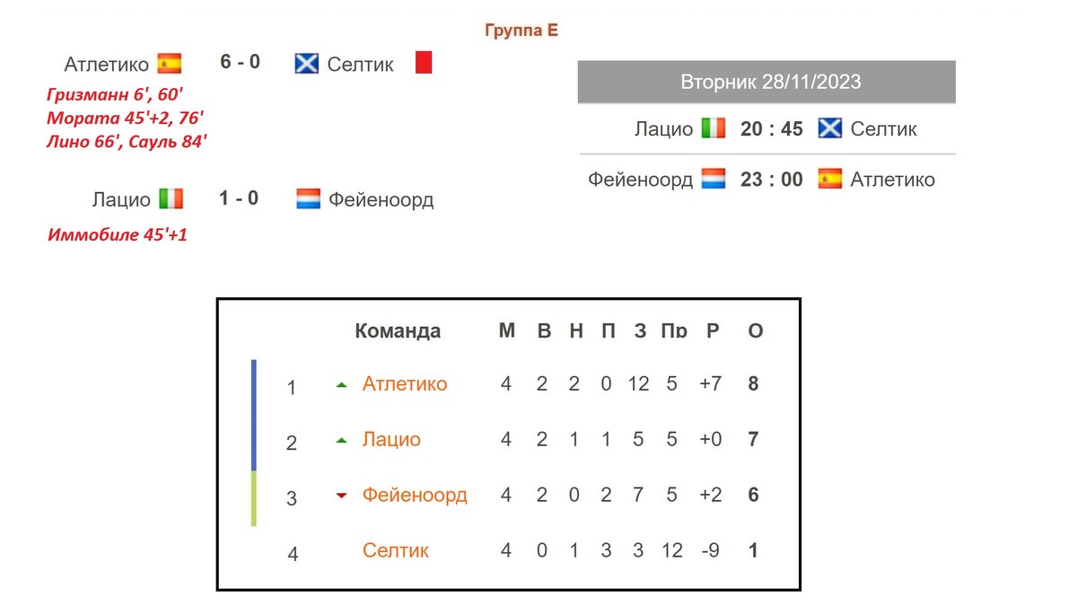 В Лиге Чемпионов стартовал 4-й тур. Определились первые участники плей-офф. Начинаю обзор с результатов группы Е. Атлетико разгромил Селтик 6-0. У Антуана Гризманна и Альваро Мароты – по дублю. Селтик удивил тем, что подошёл к игре с серией из 6 матчей без поражений, но сегодня пропустил 6 голов. Лацио взял реванш у Фейеноорда за поражение в 1-м круге (1-0). Иммобиле оформляет свой 200-й гол за Лацио. История противостояний этих клубов началась относительно недавно – в 2000-м году. С тех пор голландцы одержали 3 победы, итальянцы – вторую, включая сегодняшний матч. Таблица. Расписание. 5-й тур в группе пройдут 28 ноября. Лацио примет Селтик, а Фейеноорд - Атлетико. . Группа F. Боруссия Дортмунд вновь обыграла Ньюкасл 2-0. Напомню, в первом круге немцы одержали выездную победу над «сороками» 1-0. Милан взял реванш у ПСЖ со счетом 2-1. Команды встретились в 7-й раз, в прошлой игре (25 октября) парижане одержали первую в истории победу (3-0). Остальные матчи закончились вничью или в польз