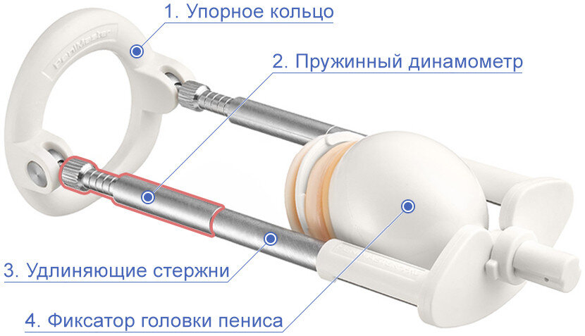 Прибор растягивает орган через две точки опоры — кольцо (1), которое упирается в лобок, и фиксатор головки (4). Между ними создается и поддерживается равномерное натяжение через симметрично расположенные стержни (3), в которые встроен пружинный динамометр (2).