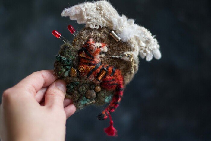 Большая войлочная брошь или скорее панно с восточными мотивами и эклектичным декором - использовались кристаллы и натуральные камни, катушка индуктивности, резистор и кварцевый резонатор, шестерёнки, лампочки и пуговка-гирька, которой больше 100 лет. Идея была в том, чтобы использовать как можно больше нешерстяных элементов, но при этом создать гармоничную композицию и поддержать концепцию работы. В декоре использовано более 20 видов декора. Работа называется "Гармонизатор" - она про мужское и женское начало, про огонь и воздух. А сочетание кристаллов, компонентов электрических цепей и копанины стало моим любимым - это всё про энергию в физическом и эзотерическом смысле. Сухое валяние из шерсти, а также янтарь, кожа, жемчуг, кристаллы кварца, яшма, галтовка цитринов, бархатные ленты, кружево, ткань, цепочки, пуговка-гирька с раскопок, шёлковый шнур, шёлк в волокне в прядках и в вате, кудри, непсы, шестерёнки, вышивка, латунь, лампочки, резистор, катушка индуктивности и кварцевый резона