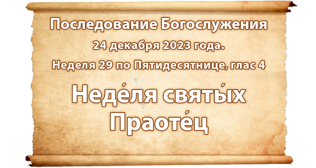 По ссылке на страницу последования богослужения можно скачать в разных форматах службу на 24 декабря: Неделя 29 по Пятидесятнице, святых праотец. Глас 4. Прямая ссылка на полное последование богослужения 24 декабря 2023 г. на резервной странице. Резервная страница проекта: https://posledovanie.my1.ru/index/0-2 Телеграм канал проекта https://t.me/posledovanie/ Телеграм чат https://t.me/ChatPosledovanie Поддержать Последование: молитвой, репостом, добрым словом или материально: http://posledovanie.ru/pomoshch-saytu/ Избранные тексты богослужения: Тропа́рь воскре́сный, глас 4: Све́тлую Воскресе́ния про́поведь/ от А́нгела уве́девша Госпо́дни учени́цы/ и пра́деднее осужде́ние отве́ргша,/ апо́столом хва́лящася глаго́лаху:/ испрове́ржеся смерть,/ воскре́се Христо́с Бог,// да́руяй ми́рови ве́лию ми́лость. Тропа́рь пра́отцев, глас 2: Ве́рою пра́отцы оправда́л еси́,/ от язы́к те́ми предобручи́вый Це́рковь:/ хва́лятся в сла́ве святи́и,/ я́ко от се́мене их есть Плод благосла́вен,/ без се́мене