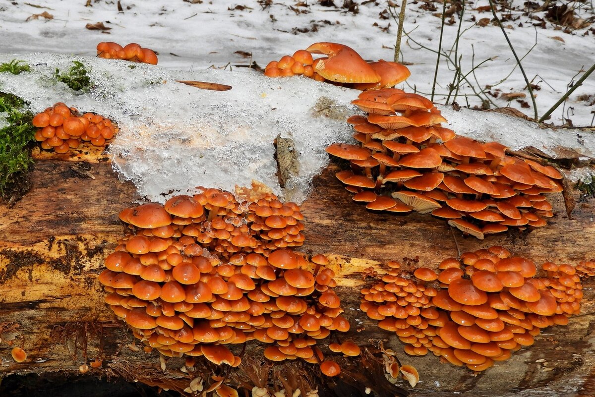 Фламмулина. Это настоящий поздний лесной гриб, который иначе называют зимним опёнком. Многие любители тихой охоты утверждают, что это один из самых вкусных грибов. Фламмулина, как и некоторые виды лесной вешенки, может плодоносить зимой при лёгком морозе.