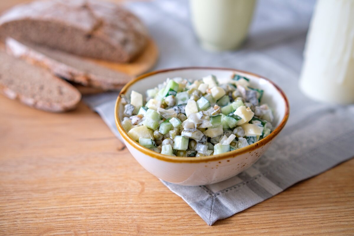 Смешайте огурцы, яблоко, горошек и орехи, заправьте салат майонезом.