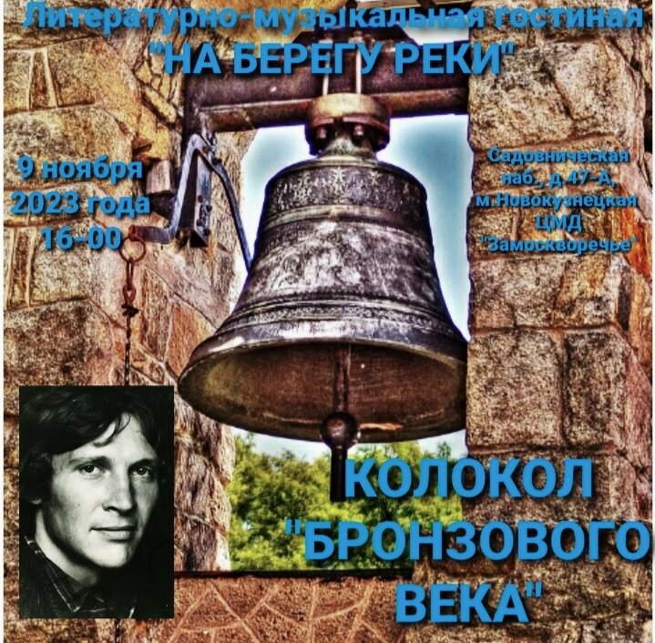 Встреча в Литературно -музыкальной гостиной "На берегу реки". 9 ноября 2023 года в 16.00 Адрес: Москва Садовническая набережная 47 А м. Новокузнецкая ЦМД "Замоскворечье" Встреча сезона 2023-2024 КОЛОКОЛ БРОНЗОВОГО ВЕКА Откройте для себя поэта Олега Охапкина, идеолога концепции "Бронзового века" русской литературы. Встречу проведет ведущая - поэт Елена Лышковская. Вам предоставится возможность выступить, поделиться своим творчеством с гостями вечера и познакомиться с талантами России. Вход свободный. В Литературно-музыкальной гостиной всегда рады гостям!