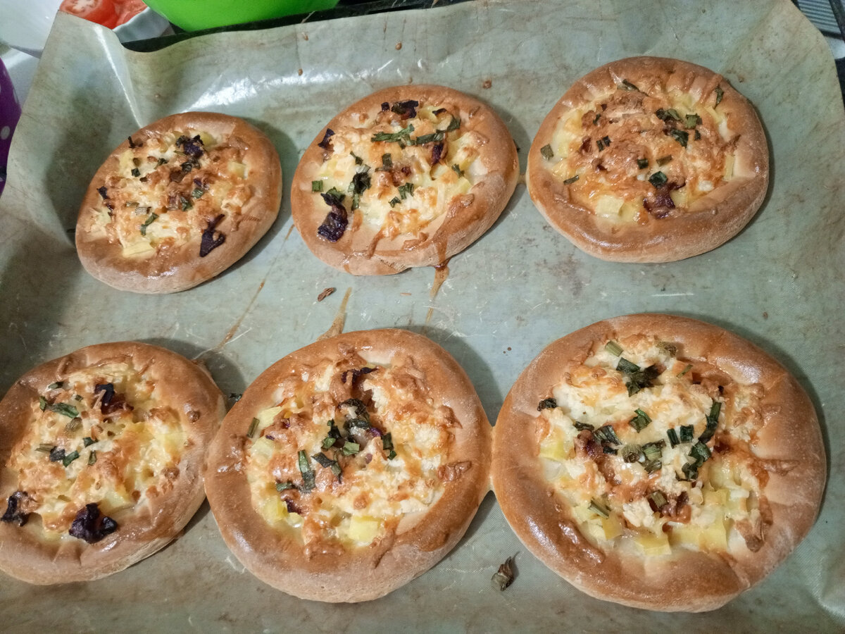 Сегодня хочу поделиться с вами собственным рецептом грибной мини-пиццы. Также я называю эту выпечку грибным открытым мини-пирогом. Блюдо получается не очень затратным, но при этом вкусным и сытным. Для приготовления пиццы вам потребуются: - бекон или вареные грибы (я брала и то, и другое), - репчатый лук, - картофель, - сыр твердый и сыр плавленный, - зеленый лук, - свежие помидоры. Для приготовления пиццы я использую дрожжевое тесто универсальное. Чтобы замесить один килограмм такого теста, возьмите: - 650 гр муки, - 20 граммов живых дрожжей, - 250 мл воды или молока, - 6 гр соли, - 60 гр сахара, - 60 мл растительного масла. Сначала ставлю опару - наливаю в кастрюлю 250 мл теплой воды и добавляю все дрожжи и 200 граммов муки. Когда опара подойдет, добавляю все остальные ингредиенты и начинаю заниматься начинкой. В моей семье не все любят грибы, поэтому половину пиццы я делала с грибами (тополевая рядовка), а половину - с беконом. Обжарила по отдельности бекон и гриб