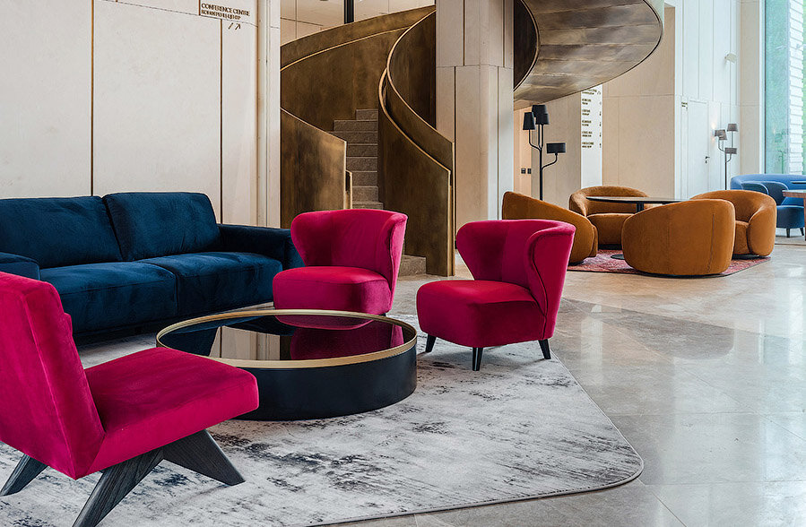 Архитекторы Front Architecture создали для бутик-отеля Radisson Blu на Ленинском проспекте интерьер, который вдохновлен эстетикой модернизма и транслирует идею космоса так, как ее трактовали древние греки, — это и миропорядок, и гармония в эстетике вещного мира. В отеле 164 номера площадью от 30 кв м, ресторан на 150 мест с шоу-кухней, лобби-бар, банкетный зал, трансформируемый конференц-зал и переговорные комнаты, при отеле построен фитнес-клуб площадью 3250 кв м с зоной SPA, бассейном и боксерским рингом — интерьеры фитнесса также созданы Front Architecture.