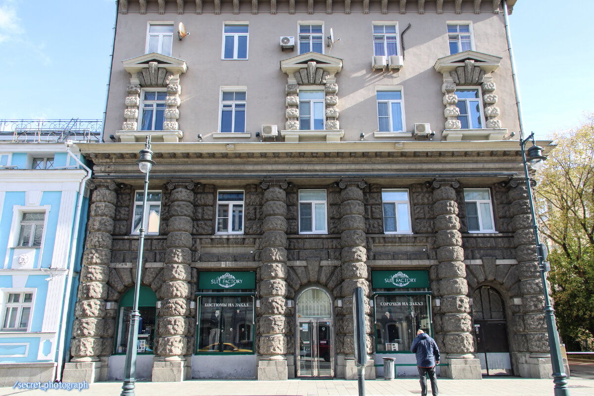 Чуть больше года назад я писал о Спасо-Влахернском женском монастыре, что в поселке Деденево Дмитровского района. Прекрасное, умиротворяюще-тихое место, где было приятно побывать и о котором было интересно писать. Сегодняшний же герой очередной нашей «маленькой истории» – доходный дом на Малой Дмитровке, построенный по заказу духовенства той обители в 1914-1915 годах архитектором Василием Ивановичем Ерамишанцевым, мастером русского модерна, членом Московского архитектурного общества, в советские годы состоявшим в Союзе архитекторов СССР. Признаться, дом несколько брутальный, особенно если держать в памяти тот факт, что обитель – женская. Конечно, видел я много зданий с рустованными фасадами, но здесь... ...Всем рустам руст! Словно взяли глыбу гранита, раскололи на куски, да так из тех кусков и сложили новый фасад (6 фото). Впрочем, таковы лишь первые два этажа. Все, что находится выше, смотрится гораздо смиреннее. И только оформление трех окон и карниз между четвертым и пятым этажами д