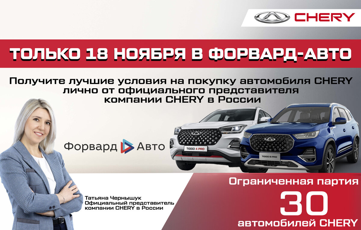 Давно хотели приобрести новый автомобиль? У вас появилась такая возможность! Впервые в Уфе в Форвард-Авто официального дилера CHERY, только 18 ноября, один день! Прилетают представители завода CHERY для знакомства с покупателями, а также предлагают возможность приобрести 30 новых автомобилей с максимальной выгодой + зимняя резина в подарок. Всего 30 автомобилей по выгодным ценам. Так же представители ответят на все интересующие Вас вопросы. Забирайте свой CHERY в Форвард-Авто на Салаватке. Приезжайте по адресу: г.Уфа ,проспект Салавата Юлаева,60 По всем вопросам обращайтесь по номеру телефона : 8 (347) 286 55 50