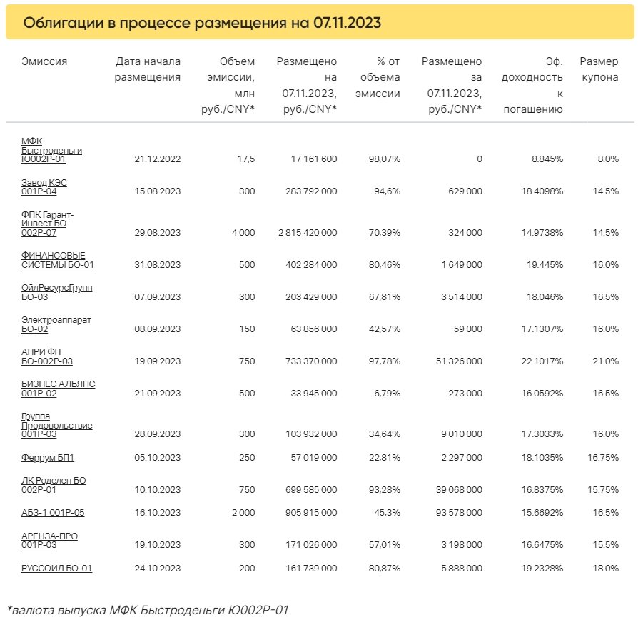 Коротко о торгах на первичном рынке 7 ноября на рынке ВДО новых размещений не было. Рассмотрим выпуски с максимальным объемом выкупа за вчерашний день, размещение которых пока не закончено. По выпуску АБЗ-1 001P-05 объемом 2 млрд рублей привлечено еще 93,6 млн рублей. Эмиссия состоялась на 45,3%. На втором месте по объему первичного размещения — выпуск АПРИ ФП БО-002Р-03: привлечено 51,3 млн рублей. После начала размещения дополнительного выпуска эмиссия облигаций объемом 750 млн рублей состоялась почти на 98%. Ставка 21% годовых установлена на первый год обращения. Замыкает тройку лидеров выпуск ЛК Роделен БО 002P-01 с дневным объемом выкупа 39 млн рублей. Облигации объемом 750 млн рублей и ежемесячным купоном 15,75% годовых размещены на 93,28%.