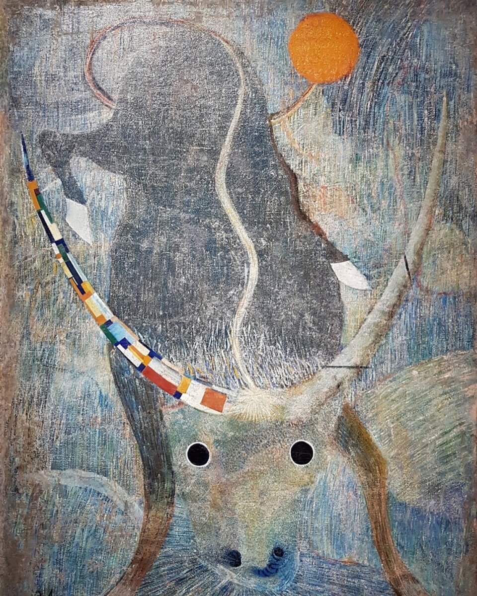 «Быка» чаще рассматривают в ряду произведений других художников из экспозиции музея. Но если поставить рядом немногие другие сохранившиеся произведения самого Лысенко («Великие силы», «Силы земные»), стоит признать, что мир фантазии был ему близок. У быка разные рога, один из которых богато декорирован геометрическими рисунками. Тонкие, плоские, пластичные как водоросли в воде передние ноги. Если показать фотографию этой работы студентам на экзамене и попросить определить стилистику, варианты будут от примитивизма до модерна, некоторые вспомнят фрески Кносского дворца. Это действительно в первую очередь декоративное изображение, и не исключено, что выбор цвета глаз был продиктован в первую очередь вкусом художника. Он мог следовать за внутренним представлением о красоте пятен, цветовых сочетаний. И быть при этом антисоветчиком, антифашистом или даже совершенно аполитичным человеком.
