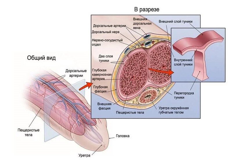 Чтобы понять, как происходит процесс увеличения пениса, необходимо понять, как он устроен. Подробно рассматривать пенис не будем — сосредоточимся на том, что важно для увеличения. В двух словах: размер члена при эрекции зависит от размера губчатых, кавернозных тел. Чем больше они наберут в себя крови, тем больше будет пенис. Однако кавернозные тела покрыты плотной белочной оболочкой, которая плохо растягивается и служит препятствием для увеличения пениса. Рассмотрим картинку: Теперь же перейдем к главному. Для чего мы рассматривали тунику и каверны? Для примера рассмотрим автомобильное колесо. Оно состоит из камеры и шины. Так вот, туника (белочная оболочка) в половом члене выполняет роль шины. А вот каверны — это своего рода камера в половом члене. И чтобы увеличить член, нам необходимо сначала растянуть «шину» — тунику полового члена, а затем накачать «камеру» — каверны. Так «работает» джелк – сначала цикл упражнений на растягивание туники, потом — на прокачивание пещеристых тел. За