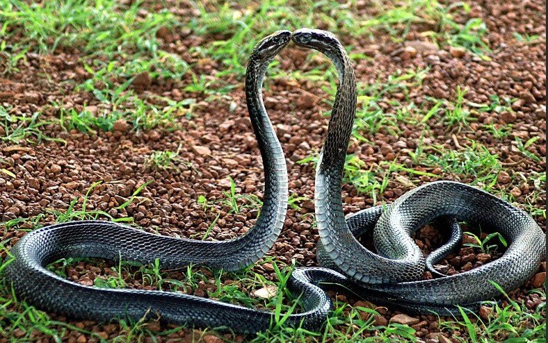 Как вы думаете, что происходит, когда одна королевская кобра встречается с другой? Они пытаются коснуться макушки друг друга, чтобы показать своё превосходство. Та, которой это не удалось – уползает. Напомню, что королевская кобра (гамадриад) – эта самая крупная ядовитая змея на нашей планете. Живёт она коло тридцати лет и всё это время растёт. Её длина может достигнуть более пяти метров. Обитает королевская кобра в тропических лесах разных типов, мангровых и бамбуковых зарослях, на высокотравных лугах Южной и Юго-Восточной Азии, её можно встретить в Индии, например, на чайных плантация. Королевская кобра относится к роду Ophiophagus (офиофагус), что в переводе с латинского означает «поедатель змей». Так и есть, ведь её ежедневный рацион состоит из других змей, том числе и ядовитых. Охотится она как днём, так и ночью. Кроме других змей, предпочитает рептилий и птиц, поедает птичьи яйца, опасна для человека. В передней части рта у кобры есть полые клыки, которые прикреплены к верхне