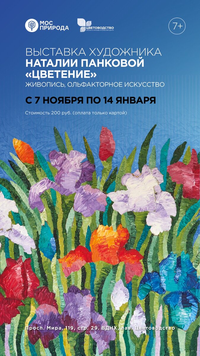 Посетить выставку художника Наталии Панковой, посвящённую теме жизни и развития растений, можно с 7 ноября до 14 января 2024 года. Выставка современного российского художника Наталии Панковой «Цветение» гостеприимно распахнёт свои двери в экоцентре «Цветоводство» 7 ноября. А торжественное открытие, в рамках которого пройдёт кураторская экскурсия по выставке, состоится 9 ноября в 16:00. Посетить выставку, на которой представлены произведения искусства, объединённые темой жизни и развития растений, можно будет до 14 января 2024 года включительно. Развернувшаяся в экоцентре экспозиция раскроет самый красивый и завораживающий период жизни растений – период цветения, символизирующий самые яркие и эмоционально насыщенное образы, эмоции, настроение. Наслаждаться «Цветением» в экоцентре «Цветоводство» могут все желающие старше 7 лет с 10:00 до 18:00 ежедневно со вторника по воскресенье. Открытая мастерская художника Помимо получения эстетического и визуального удовольствия от созерцания работ