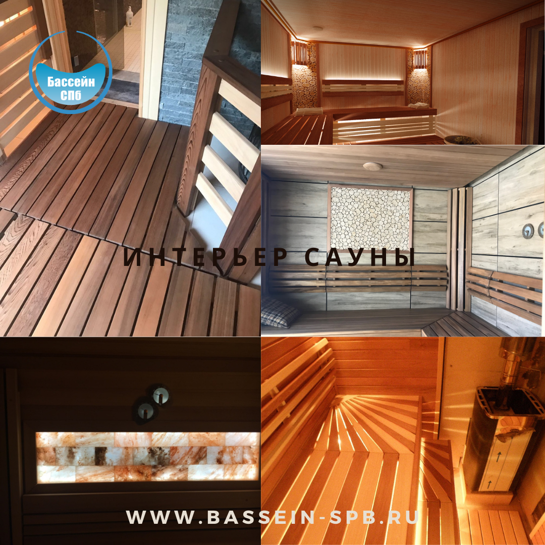 Внутренний интерьер сауны может быть разнообразным. Приведем несколько примеров. Облицовку стен, потолка, лежаков можно скомбинировать из пород дерева разного цвета. Отличным украшением стен может служить панно из можжевельника или, в качестве декора, можно использовать вставку из гималайской соли, которая обладает еще и оздоровительным эффектом. Вставки из гималайской соли могут служить и дополнительным источником освещения. Часто в саунах устанавливают подголовники над лежаком. Лавки в сауне могут быть одноярусными и двухуровневыми. Выбор электрических печей огромен. Есть напольные и подвесные печи с диапазоном мощности в зависимости от размеров сауны и с разным функционалом.