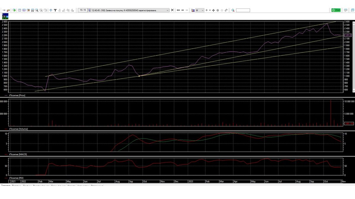 1. До конца ноября, скорее всего акция продержится в коридоре 2100-2300 ближе к уровню 2300, иногда могут быть проливы к уровню 2100. Как будут утверждены дивиденды на декабрь и определены размеры дивидендов на 2024 год, скорее всего они будут в сторону увеличения. Это даст стимул быкам начать движение на вверх к середине декабря зайти в коридор 2450-2600 и находится в середине коридора.