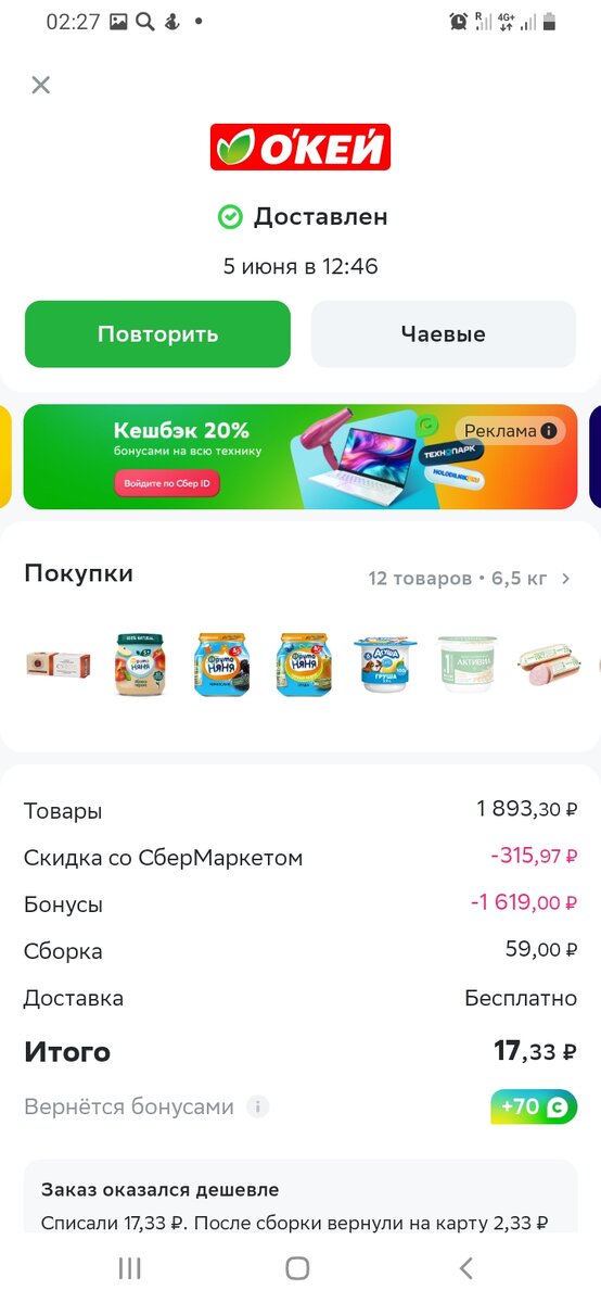 Недавно я сделала заказ в сбермаркете на 51р, вернулось 350р бонусами спасибо. Офигеть, - сказала я мужу и коту. Нам принесли продукты, и нам же еще и доплатили за них. Честно, это самый удачный мой заказ из всех. У меня были заказы и на 17р, и на 79р, на 231р и т.д