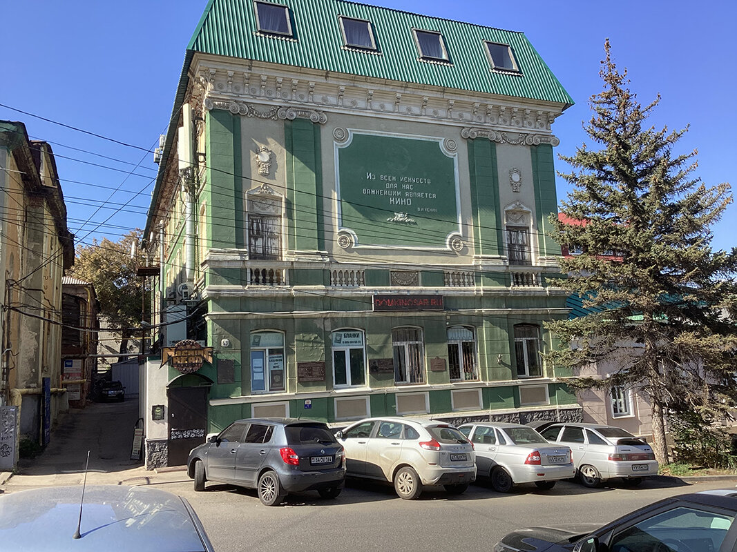 На светло-зеленом фасаде бывшей Нижне-Волжской студии кинохроники, естественно, не пережившей перестройку, – знакомые с детства и тем более неожиданные в наши дни слова. «Из всех искусств для нас важнейшим является кино. В.И. Ленин».