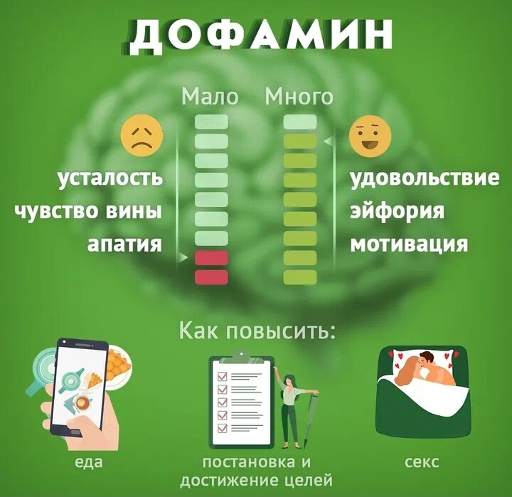 Первый гормон счастья о котором я бы хотел рассказать это : Дофамин - один из ключевых составляющих нейромедиаторов в центральной нервной системе, который играет важную роль в регуляции физиологических и психологических функций организма. Этот биохимический мессенджер отвечает за передачу сигналов между нервными клетками и контролирует активность определенных областей головного мозга. Одной из основных функций дофамина является участие в желании к творению к двигательной активности и созидании. Он влияет на координацию движений, контролирует мышечный тонус и способствует выполнению сложных моторных задач. Помимо этого, дофамин играет важную роль в регуляции памяти, формирования новых навыков и связывания информации с эмоциональными впечатлениями. Кроме того, дофамин отвечает за управление чувством удовлетворения и вознаграждения. Этот гормон активируется при приятных событиях, а также положительно влияет на ощущение удовольствия и мотивацию. Недостаточное количество дофамина в организ