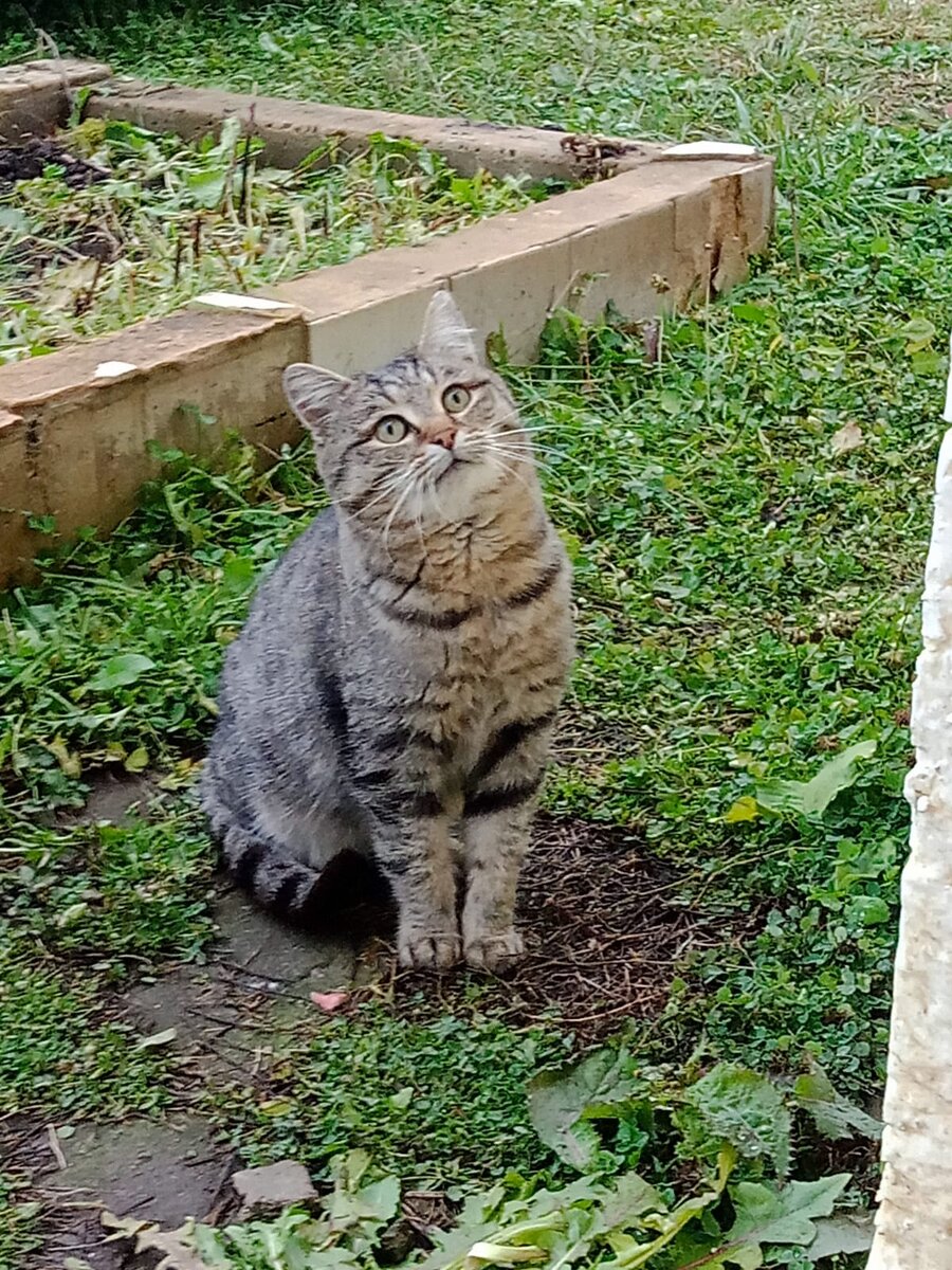 Наелся, пришёл, сел у дома и облизывает лапы, моется.