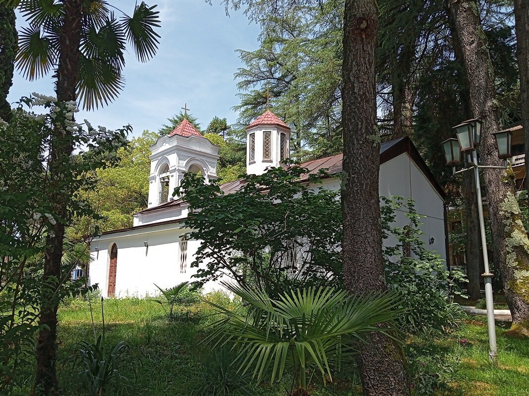 Между прочим, на территории пансионата «Айтар» расположен древний храм Святого великомученика и Победоносца Георгия. Построен он был в 1827 году на месте древнего христианского храма 11 века. В 19 веке французский учёный и путешественник Де Монпере сделал зарисовки Абхазии в своём дорожном альбоме, куда попало изображение и этого храма. Я нашла его рисунки, но точно определить, какие здесь храмы изображены, у меня не получилось.