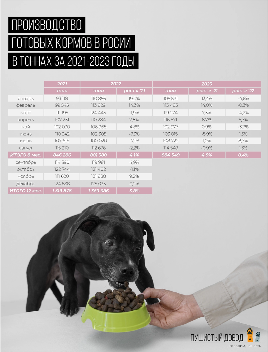 Давайте разбираться все ли, так радужно!? На фоне закрытия Россельхознадзором большого количества западных производителей в первую очередь за несоответствие заявленного состава фактическому, эта новость не может не радовать. И так, SoyaNews, ссылаясь на оперативные данные ЕМИСС заявляет, что в августе 2023 года в России произвели 114,5 тыс. тонн готового корма для непродуктивных животных - на 5,0% больше, чем месяцем ранее, и на 1,3% больше, чем в августе 2022 года. За 8 месяцев 2023 года по сравнению с аналогичным периодом 2022 года производство данного товара в России выросло на 0,4%. За период с января 2021 года объём производства готового корма для непродуктивных животных, зафиксированный в январе 2021 года (93,1 тыс.тонн) стал минимальным, обращает внимание SoyaNews. Максимальный же объём данного продукта произведен в декабре 2022 года - 125,0 тыс. тонн. Давайте попробуем посчитать самостоятельно! Если смотреть в долгосрочной перспективе, динамика роста такова: 1. Рост в кил