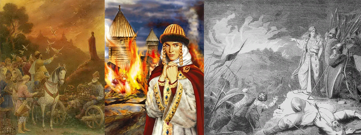 Сказала же им Ольга, что-де «я уже мстила за обиду своего мужа, когда приходили вы к Киеву, и во второй раз, а в третий – когда устроила тризну по своем муже. Больше уже не хочу мстить, – хочу только взять с вас небольшую дань и, заключив с вами мир, уйду прочь». Древляне же спросили: «Что хочешь от нас? Мы рады дать тебе мед и меха». Она же сказала: «Нет у вас теперь ни меду, ни мехов, поэтому прошу у вас немного: дайте мне от каждого двора по три голубя да по три воробья. Я ведь не хочу возложить на вас тяжкой дани, как муж мой, поэтому-то и прошу у вас мало. Вы же изнемогли в осаде, оттого и прошу у вас этой малости». Древляне же, обрадовавшись, собрали от двора по три голубя и по три воробья и послали к Ольге с поклоном. Ольга же сказала им: «Вот вы и покорились уже мне и моему дитяти, – идите в город, а я завтра отступлю от него и пойду в свой город». Древляне же с радостью вошли в город и поведали обо всем людям, и обрадовались люди в городе. Ольга же, раздав воинам – кому по голубю, кому по воробью, приказала привязывать каждому голубю и воробью трут, завертывая его в небольшие платочки и прикрепляя ниткой к каждому. И, когда стало смеркаться, приказала Ольга своим воинам пустить голубей и воробьев. Голуби же и воробьи полетели в свои гнезда: голуби в голубятни, а воробьи под стрехи, и так загорелись – где голубятни, где клети, где сараи и сеновалы, и не было двора, где бы не горело, и нельзя было гасить, так как сразу загорелись все дворы.