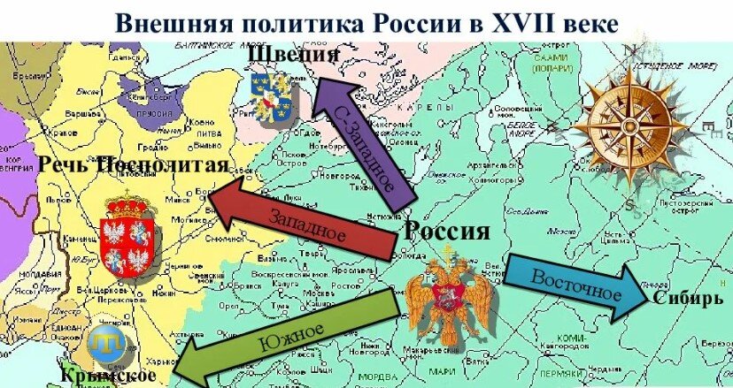 После Смуты Россия оказалась в международной изоляции. На Западе был потерян Смоленск, на северо-западе - выход к Балтийскому морю, на юге приходилось постоянно отражать атаки крымского хана. Главным направлением внешней политики России стало западное, так как в первой половине XVII в. необходимо было не только вернуть земли, попавшие под власть Польши, но и утвердить в борьбе с королевичем Владиславом, претендентом на московский престол, законность династии Романовых. Во второй половине XVII в. движение Богдана Хмельницкого на Украине также выдвинуло на первый план русско-польские отношения.