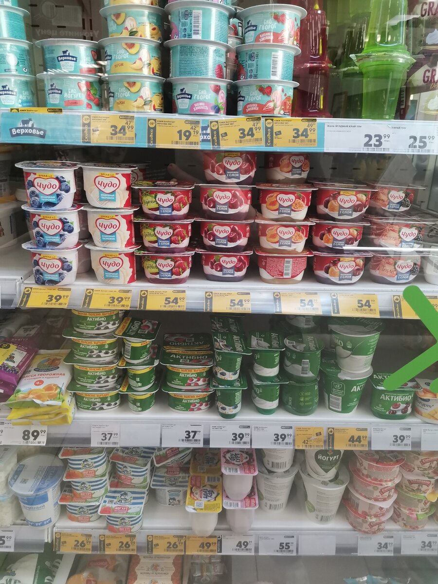 Каждый завтрак стал сопровождаться какими-либо йогуртами, творогом и т.д., так что данную категорию просматриваю постоянно. Рекомендую творог от "Верховье", он вкусный и недорогой, а нынче на один из вкусов еще и большую скидку сделали - стоит всего 19 рублей. Для сравнения рядом творог этого же производителя и тоже со скидкой, только цена уже 34 рубля. Я на радостях в итогу купила все упаковки по 19 (и нет, срок годности у них не выходит, они такие же, как и все остальные).