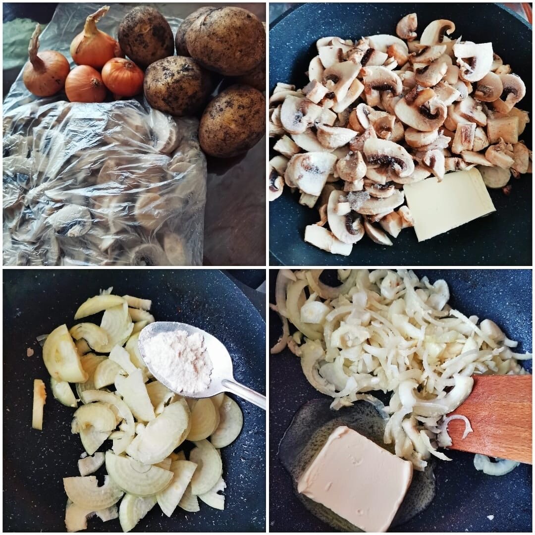 Привет! Рада видеть тебя на своем канале! Часто сталкиваюсь с тем, что меньше чем за полтора часа необходимо приготовить что-то вкусное и сытное. И этот рецепт картофельной запеканки с грибами выручает всегда. Вообще, в целом, я обожаю такие блюда, в которых простые ингредиенты и они легки в приготовлении. Ингредиенты: Приготовление: Обжариваем грибы на сливочном масле до полуготовности. Затем обжариваем лук, но перед этим лук перемешиваем со столовой ложкой муки. Картофель нарезаем на кольца и перемешиваем с предварительно обжаренными луком и грибами. Добавляем сметану, соль и перец по вкусу, и зелень (у меня укроп). Всё хорошенько перемешиваем и отправляем в предварительно разогретую до 200 градусов духовку. Первые 20 минут запекаем при 190 градусах. По истечению 20 минут закрываем запеканку фольгой и уменьшаем духовку до 170 градусов. Затем запекаем 20 – 30 минут, смотрите по готовности. P.S. количество ингредиентов смотрите под себя, у меня 8 штук картофеля средних размеров, 4 лука