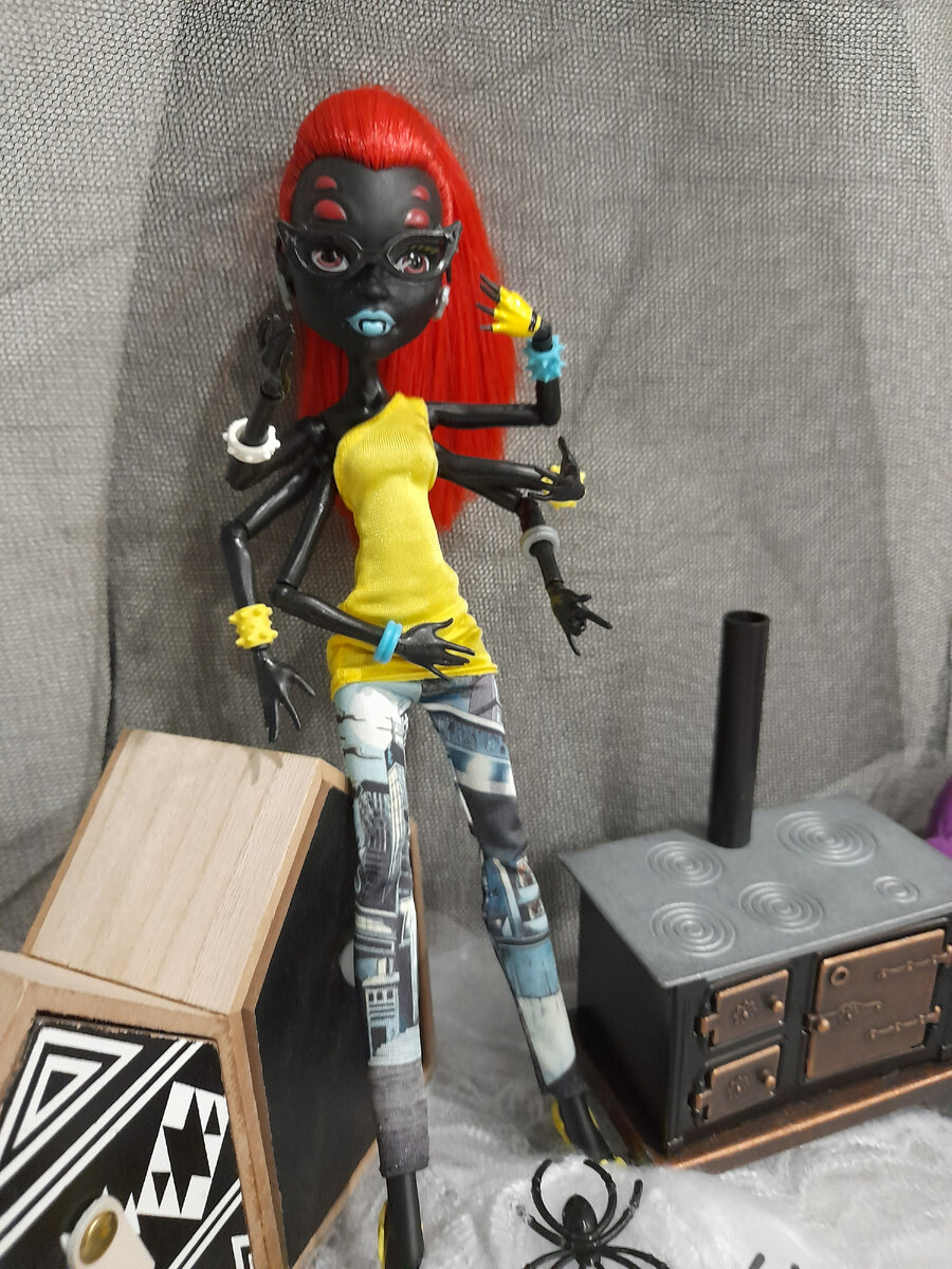 Всем привет! Сегодня расскажу об еще об одной из самых необычных кукол из своей коллекции. И это уникальная Wydowna Spider I Love Fashion Doll. Мне эта кукла досталась с Авито, уже довольно давно. Досталась она мне только с одним нарядом, зато в идеальном состоянии. И именно этот наряд из всего набора нравился мне больше всего. Вайдонна (или, по-домашнему, Донна) покорила с меня с первого взгляда своей необычностью и самобытностью. В коллекции Monster high только две куклы с несколькими парами рук, как у нее – собственно Донна и Кала Мерри Большой Скарьерный Риф. И только у Донны именно три пары рук. У куклы темный скинтон, самый темный среди всех, она действительно уголек. Волосы оранжево-красные. Глаз несколько пар, ведь кукла изображает паука. Две пары глаз красные, без зрачков. Главные глаза розовые с красным ободом. Макияж тоже интересный – желтая и бирюзовая стрелочки вокруг и голубая помада с имитацией клыков. Одета Донна в желтую тунику и светло-серые лосины с принтом города. О