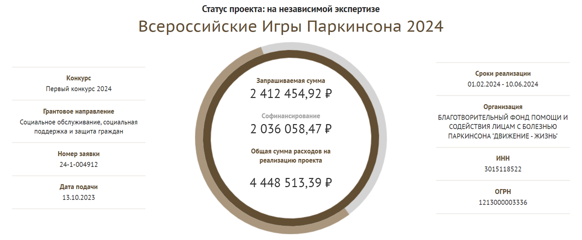 Друзья, заявка "Игры Паркинсона 2024 на Президентский грант от нашего Фонда ПРИНЯТА к рассмотрению💙 И находится в статусе "на независимой экспертизе". Подробно о проекте по ССЫЛКЕ https://президентскиегранты.рф//public/application/item?id=6b2e3ecf-768b-469e-b452-c606257caac4 По данным Фонда президентских грантов 10 502 проекта из 88 регионов РФ претендуют на гранты в первом конкурсе 2024 года.Только лучшие из лучших попадут в списки грандополучателей. Оценка заявок завершится к январю. 👍Верим и надеемся, что и в следующем году мы станем обладателями гранта и с размахом проведём наши Игры) Запланированные спортивные дисциплины ИГР ПАРКИНСОНА 2024г: