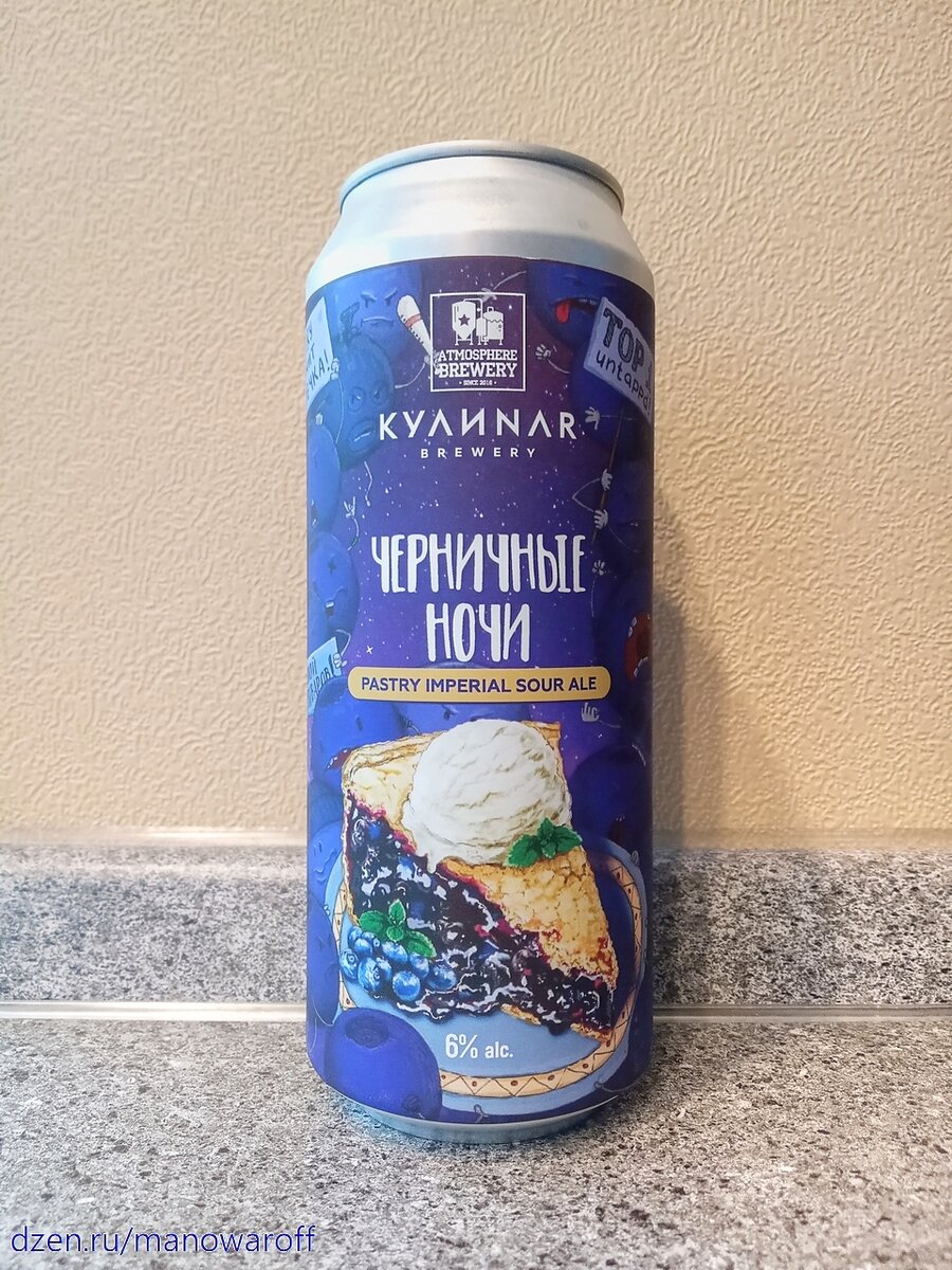 Хотя нет, там ночи темные. А черничные будут у нас в виде одноименного пива. Но это не пенное от "Горьковской пивоварни", раньше называвшееся точно так же, а нынче переименовавшееся в Blueberry Porter. Нет, сегодня у нас московская пивоварня КУЛИNAR, известная своими "штруделями" и прочей "выпечкой" в виде пива. Совместно с клинской Atmosphere Brewery они создали очередной кулинарный шедевр. Создали, как оказалось, уже больше года назад (в августе 2022), но попался мне данный имперский кисляк только что. По бокам банки изобразили митингующую чернику. В описании нам обещают всяческую вкусноту: Пирог "ЧЕРНИЧНЫЕ НОЧИ" это десерт, приготовленный на основе большого количества ягод черники и шоколадного бисквита. Хотя в составе указано только черничное пюре, без бисквита. На момент дегустации пиву исполнился месяц. Срок годности составляет 365 суток при хранении в холодильнике. ТТХ: Пиво непрозрачное. Пенка декоративная, опадает шустро. Пахнет, в основном, печеньками типа "Юбилейного". Скво