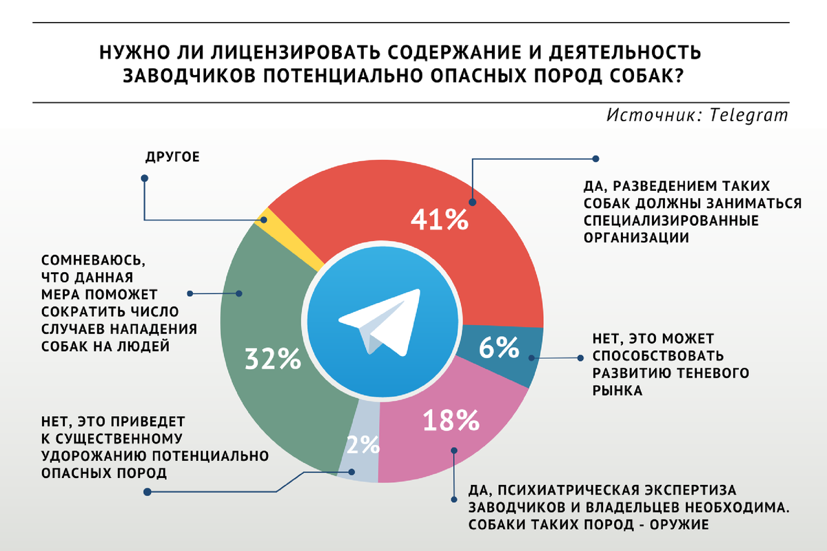 «Ветеринария и жизнь» в своем Telegram-канале провела опрос: «Нужно ли лицензировать деятельность заводчиков потенциально опасных пород собак?» Большинство участников опроса (41%) считают, что разведением таких собак должны заниматься специализированные организации. При этом 32% респондентов сомневаются, что лицензирование поможет сократить число случаев нападения собак на людей. Еще 18% опрошенных полагают, что необходимо проводить психиатрическую экспертизу заводчиков и владельцев собак опасных пород. Напомним, что в Госдуму внесен законопроект, которым предлагается ввести запрет на разведение потенциально опасных собак в жилых помещениях. По мнению авторов поправок, особую угрозу потенциально опасные собаки представляют во время выкармливания щенков: в этот период нахождение животного в квартире или частном доме представляет риск для членов семьи владельца, а также гостей и соседей. Законопроектом предлагается заниматься разведением таких собак только в нежилых помещениях, например