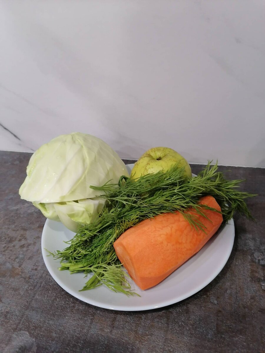 Приготовление : Тонко нарезать капусту, посолить и немного её подавить, чтобы дала сок. Нарезать соломкой яблоко и морковь, зелень. Добавить оливковое масло, сахар, соль по вкусу и сок половины лимона. Все хорошо перемешать и дать настояться 20-30 минут. Приятного аппетита!