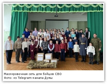 Школьники и педагоги из Читы создали длинную маскировочную сеть и передали её военным СВО, а также предоставили им тёплую одежду. Об этом сообщает ИА ChitaMedia со ссылкой на Telegram-канал (18+) Думы Читы. Отмечается, что ученики и тщательно занимались плетением, осознавая, что качество работы непосредственно влияет на безопасность и жизнь солдат Забайкальского края. Директор школы №10 Людмила Машталер поделилась, что подобные усилия будут продолжены. Военнослужащие выразили благодарность школьникам и учителям за их помощь.