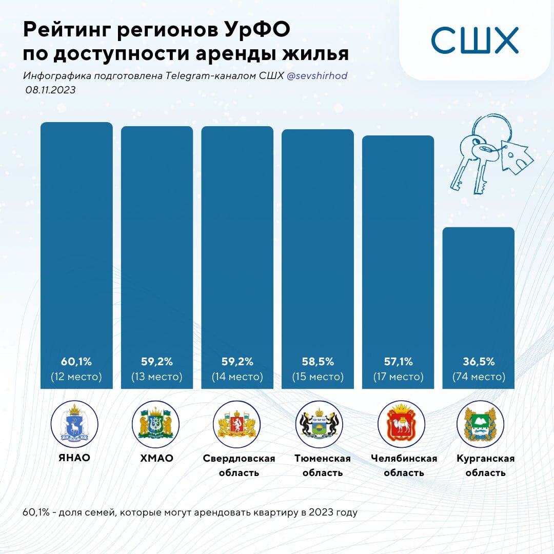 На 13 и 14 местах – Ханты-Мансийский автономный округ и Свердловская область, где аренда доступна чуть меньшему количеству: 59,2% семей. На первоочередные траты жителям Югры понадобится 122,9 тысяч рублей, а свердловчанам – 84,2 тысяч рублей.