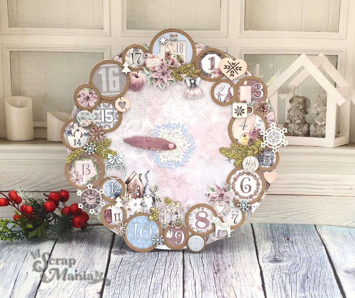 Доброго всем дня. Сегодня с вами Рамзиля. Я хочу показать одну конструкцию, которуе можно использовать и как адвент-календарь (если добавить в эту конструкцию больше цифр), и как часы (если сделать циферблат из 12 чисел). Я же сделала необычный календарь - в подарок своей дочери, у которой день рождения 18 декабря. Каждый год она делает календарь с цифрами, вешает его на стену, а потом каждый день вычеркивает прошедшую дату. Вот у меня и появилось такой календарь, который упростит ожидание праздника и украсит ее комнату. Для воплощения своей идеи использовала коллекцию "Новогодние гномы". Размер круга 30х30см, основа - плотный картон толщиной 3мм. На основании расположены круги разного диаметра. Все круги из крафтового картона вырубила ножом "Круги со строчкой", а внутри цифры от 1 и до 18 взяты из листа для адвента набора бумаги 30.5х30.5 "Новогодние гномы" . Почему до 18, спросиье Вы? Так в этот день у моей дочери день рождения, и эта дата конечная в ее "личном календаре". Стрелка