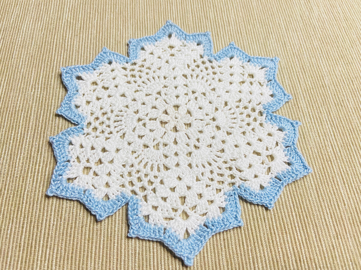 Для работы над салфеткой решила взять тонкую хлопковую пряжу двух цветов - белого и голубого. За счет голубого края получилось хорошо сакцентировать внимание на белой части салфетки.