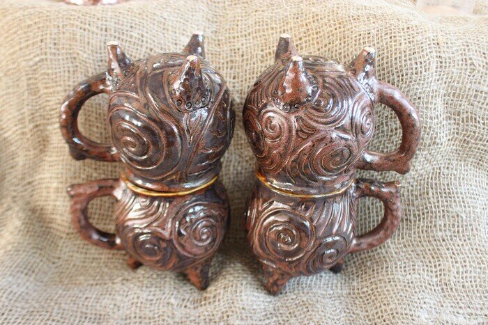 Налепил я тут интересных кружек - на вид маленькие совсем, а в объёме почти 350 мл. получились. Лепились вручную из комка керамической массы. Декорированы эффектарной глазурью "Медно-золотая", внутри прозрачная глазурь без специальной маркировки. Кружек здесь два типа: одни с драконами, другие без, просто красивые.)