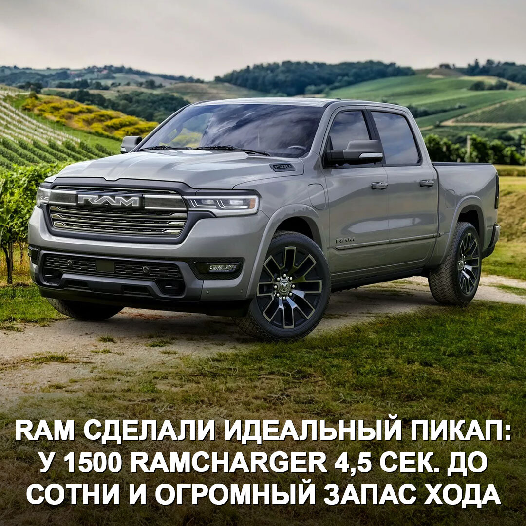 Ram 1500 Ramcharger так же быстр, как электропикапы, но не имеет их минусов: у него 4,5 сек. до сотни и запас хода свыше 1 100 км 😎 Кажется, производители поняли, что пикапы на батарейках не совсем отвечают требованиям целевой аудитории и сделали полшага назад. Новый Ram 1500 Ramcharger получил гибридную силовую установку, которая совместила отдачу электромоторов и запас хода топливного автомобиля. Техника и цифры: → Два электромотора совокупной отдачей 672 л.с. (833 Нм) и V6 3,6 л, который не имеет механической связи с колёсами, он выступает в качестве генератора. → Запас хода с полным баком и заряженной батареей — более 1 100 км, пополнить его можно как заправкой топливного бака, так и подзарядкой на быстрой станции, за 10 минут тяговый аккумулятор заряжается примерно на 80 км пути. → Грузоподъёмность — под 1 200 кг, масса буксируемого прицепа — до 6 350 кг. В основе пикапа привычная рамная конструкция, у него многорычажные подвески, а также пневма. В салоне цифровая приборка 12,3”